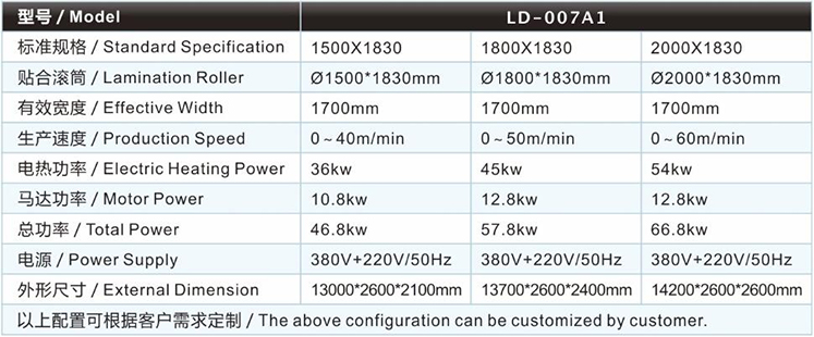 | SBR復(fù)合機(jī)/貼合機(jī)-單輪SBR復(fù)合機(jī)/貼合機(jī)LD-007A1主要技術(shù)參數(shù) / Major technical parameters |