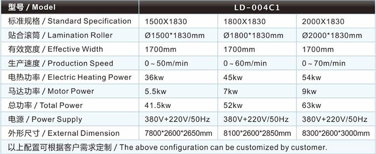 | 海綿復合機/貼合機-白膠油糊兩用復合機/貼合機LD-004C1主要技術參數(shù) / Major technical parameters |