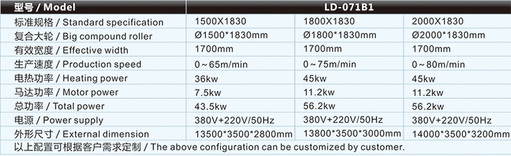 海綿復(fù)合機(jī)/貼合機(jī)-高速火焰復(fù)合機(jī)/貼合機(jī)LD-071B1主要技術(shù)參數(shù) / Major technical parameters |